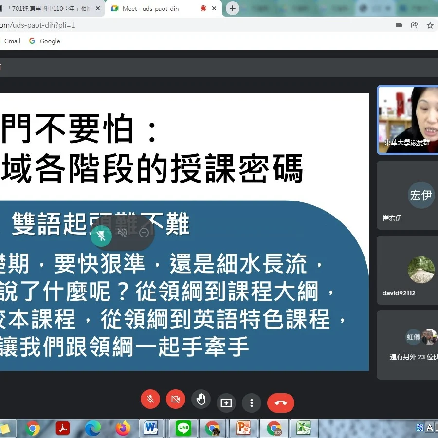 國中英語文輔導團領域召集人增能研習 講師:東華嚴愛群教授 時間:111.01.11下午13:30~1600 講題:「雙語教學向前衝還是向後轉:概念釐清與建議」 雖屆期末,眾人課務及行政事務繁忙,很感謝嚴教授指導,許多英語同業夥伴及領域團員們熱情的參與唷 !❤️