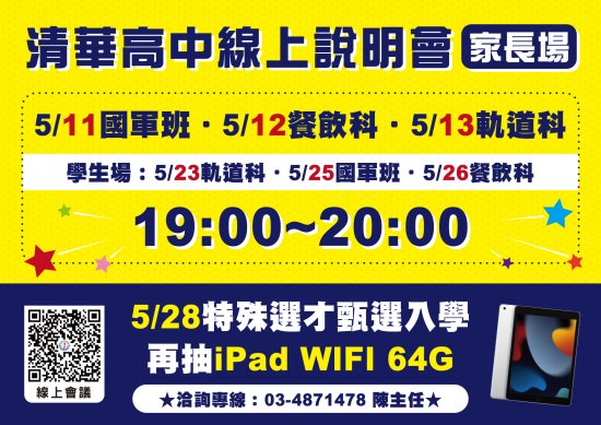 其他相關事項,歡迎電洽清華高中教務處陳昭宏主任:(03)4771196#220。