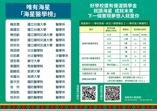 (二)透過111學年度花蓮區高級中等學校免試入學,第一志願選填海星高中,即可獲得五千元獎學金。