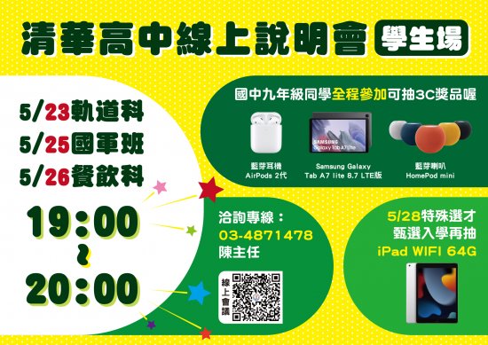 承蒙惠允協助宣傳此案,其他相關事項,歡迎電洽清華高中教務處陳昭宏主任:(03)4771196#220。