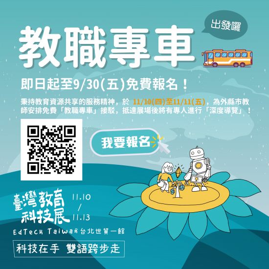 (五)承上,教職專車出發日期、時間與集合地點統一公告於「臺灣教育科技展」官網: https://www.edtech.tw/。