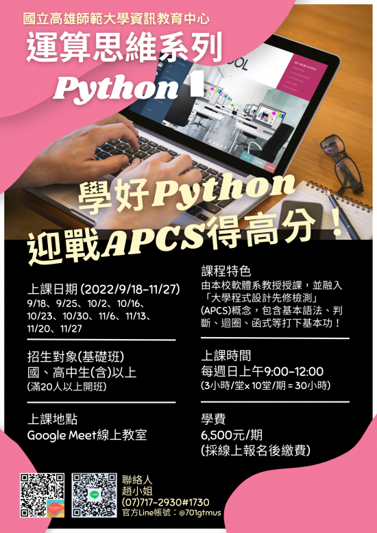 1、Python程式語言 1 (上課日期:2022/9/18-11/27)。
