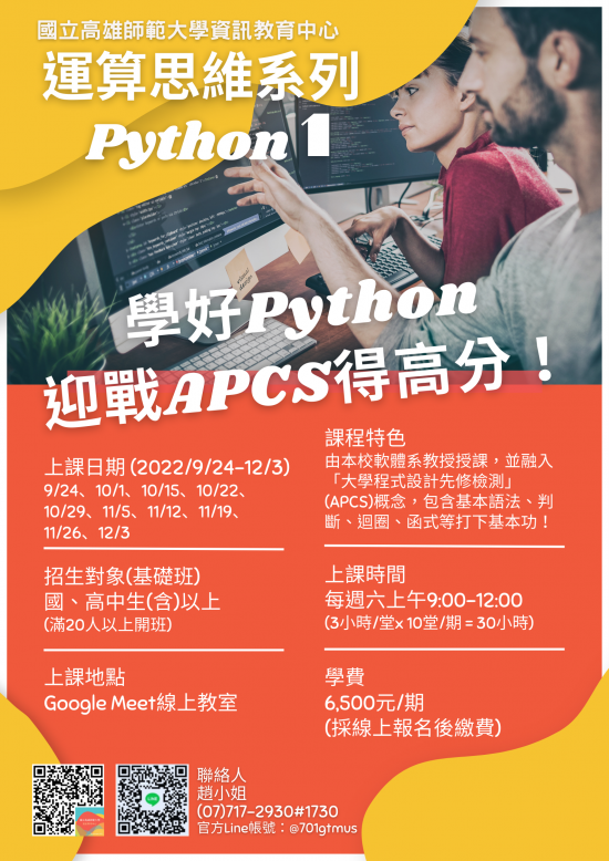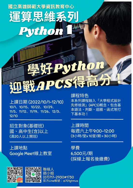 2、Python程式語言 1 (上課日期:2022/9/24-12/3)。