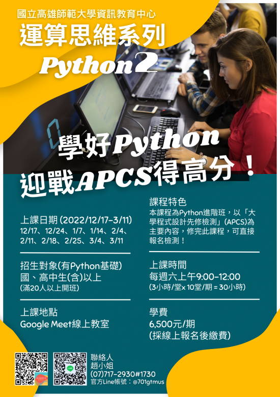 4、Python程式語言 2 (上課日期:2022/12/17-2023/3/11)。