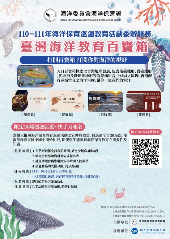 為推廣海洋保育觀念,海洋委員會海洋保育署將辦理30場全國性海洋保育巡迴教育活動,