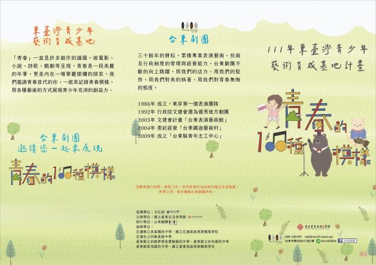 為配合場館防疫措施,每梯次上限為30人六、檢附「111年東臺灣青少年藝術育成基地計畫」宣傳摺頁電子檔供參考。
