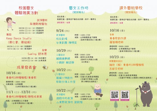 藝文工作坊-招生對象:就讀花蓮或戶籍在此的國、高中、職學生,課程費用:免費。