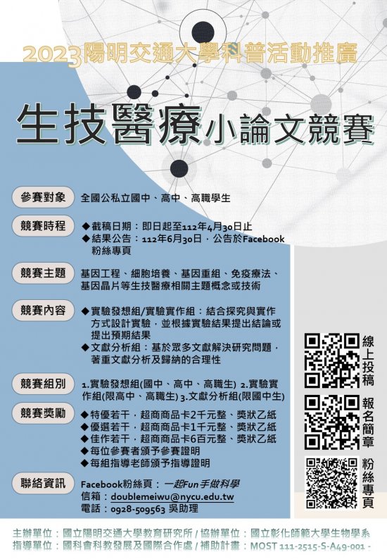「2023陽明交通大學科普活動推廣 ─生技醫療小論文競賽」徵件對象為全國公私立國中、高中及高職學生,小論文研究主題為基因工程、細胞培養、基因重組、免疫療法、基因晶片等生技醫療相關主題概念或技術,請本校師生踴躍組隊參加。