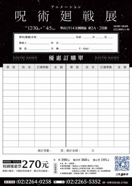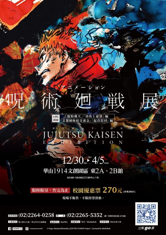 為充實國人文化藝術視野、推廣動畫教育、增進國際教育的深度與廣度,本公司特引進日本超人氣漫畫「咒術迴戰」展覽。「咒術迴戰」自2020年改編動畫後引爆全球熱潮,成為現象級動畫大作,於日本巡迴展內容分兩期展出,本次「咒術迴戰展」海外特展集結所有作品,一次完整呈現給台灣觀眾,期待透過包含數百幅原畫、分鏡圖、等身FRP、巨型動畫投影及名場還原等豐富展品,一窺圖像授權產業成功背後的密訣!