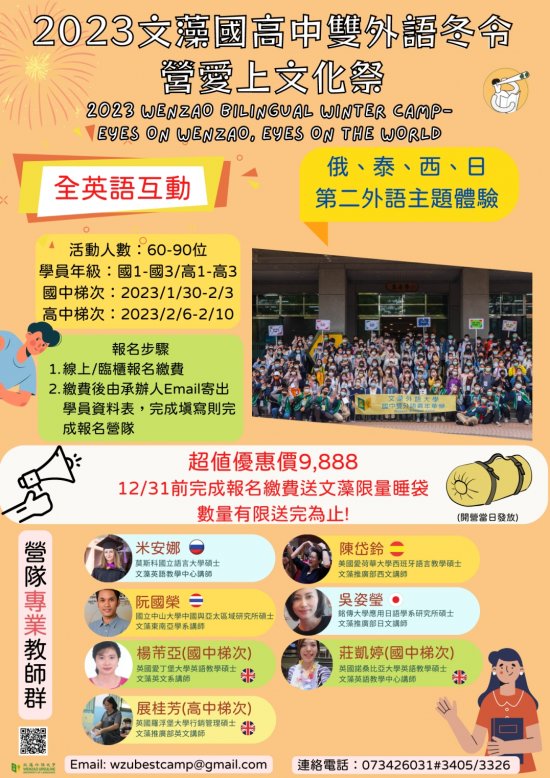 詳情可上文藻外語大學推廣部網頁查詢:HTTP://3L.WZU.EDU.TW,或洽專線(07)3458212。