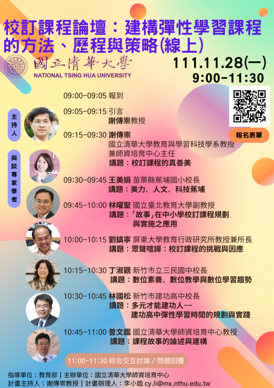 旨揭線上論壇以「校訂課程:建構彈性學習課程的方法、歷程與策略」為主題,藉由專家學者,探索教育理論與實務,以能力取向、社群與批判思維深度鑽研教學知能,厚實自我生命資歷,與自我深度對話、追求卓越,成就未來的優質教育家與終身學習者。