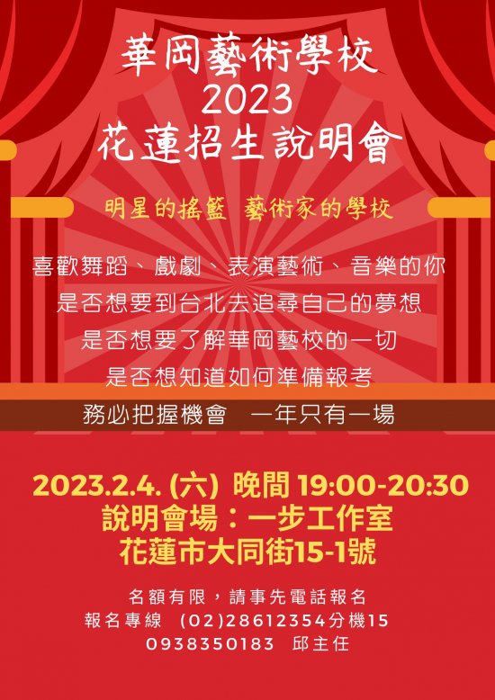 華岡藝術學校訂於112年2月4日(六)19:00-20:30舉辦花蓮招生說明會,活動地點為一步工作室(花蓮市大同街15-1號)。