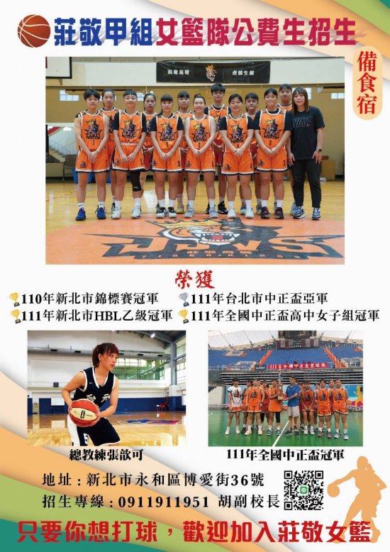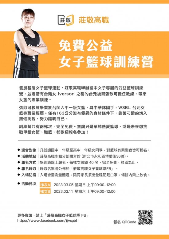 一、為協助發展基層女子籃球運動,莊敬高職舉辦國中女子專屬的公益籃球訓練營,並邀請有台灣女Iverson 之稱的台元後衛張歆可擔任教練,帶來女籃的專業訓練。無論只是單純熱愛籃球,或是未來想挑戰甲組女籃、職籃,都歡迎報名參加。