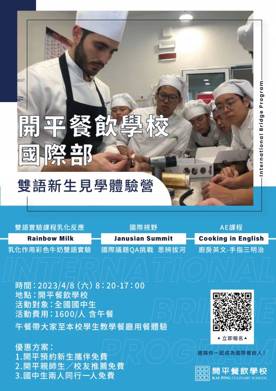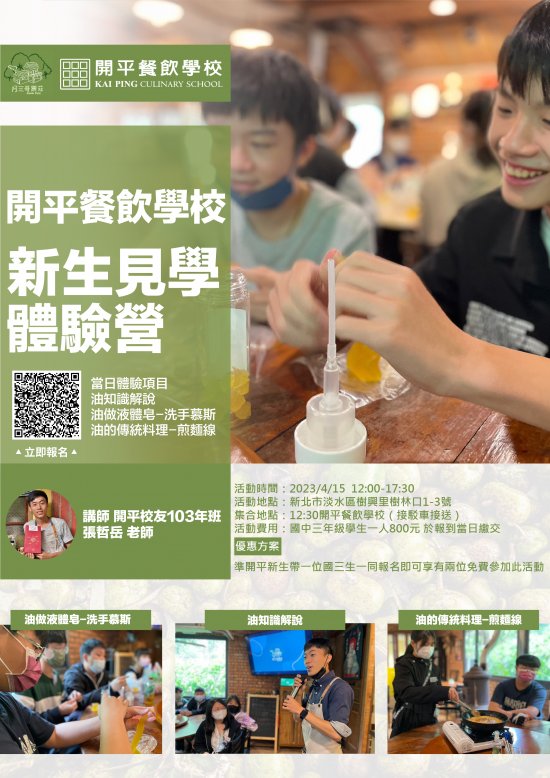 為協助對餐飲有興趣的國中生,透過有趣的專業實作,建立生涯想像,開平餐飲職業學校訂於112年4月8日(六)辦理「雙語新生見學體驗營30人」、4月15日(六)辦理「新生見學營體驗營30人」,歡迎有興趣的同學報名參加。