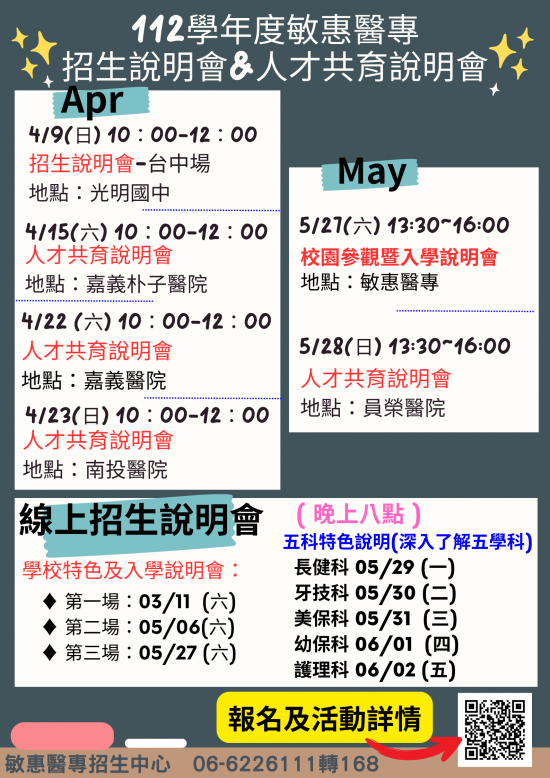 聯絡方式:敏惠醫專招生中心(06)6226111 分機168
