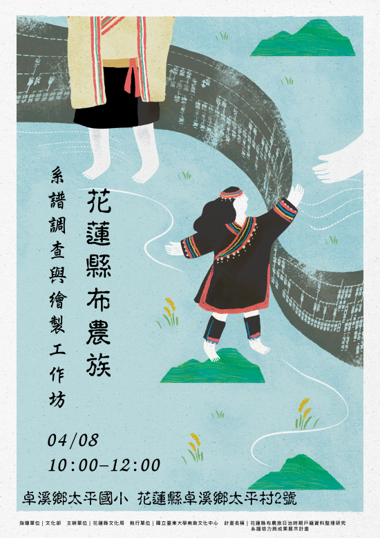 為執行旨揭計畫,謹訂於112年4月8日(星期六)上午10時至12時在花蓮縣卓溪鄉太平國小 (花蓮縣卓溪鄉太平村2號 )辦理「布農族系譜調查與繪製工作坊」,相關規劃詳如附件,請貴校派員出席共同參與。