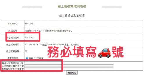 檢附實施計畫暨研習課程表暨報名加註車號範例各1份。