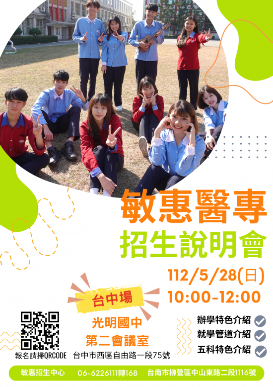 聯絡方式:敏惠醫護管理專科學校招生中心(06)6226111 分機168