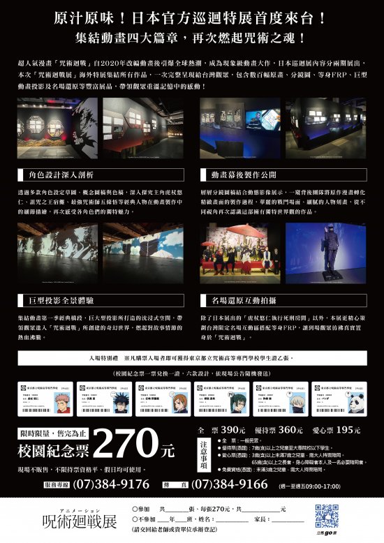 一、為充實國人文化藝術視野、推廣動畫教育、增進國際教育的深度與廣度,本公司特引進日本超人氣漫畫「咒術迴戰」展覽。「咒術迴戰」自2020年改編動畫後引爆全球熱潮,成為現象級動畫大作,於日本巡迴展內容分兩期展出,本次「咒術迴戰展」海外特展集結所有作品,一次完整呈現給台灣觀眾,期待透過包含數百幅原畫、分鏡圖、等身FRP、巨型動畫投影及名場還原等豐富展品,一窺圖像授權產業成功背後的密訣!
