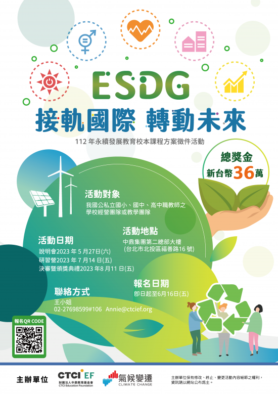 強化我國教育人員對於永續發展教育(ESD)與聯合國永續發展目標(SDGs)的認識,並了解國際上正在發生的新趨勢:ESD+SDG=ESDG,以此思維與框架設計校本位課程,接軌國際趨勢,發揮學校特色,並將SDGs融入校本課程,呼應全球與在地關鍵永續發展議題,提昇全校師生之永續發展素養。中鼎教育基金會(CTCI EF)與教育部氣候變遷教育計畫共同籌辦「ESDG接軌國際、轉動未來-112年永續發展教育校本課程方案徵件活動」。