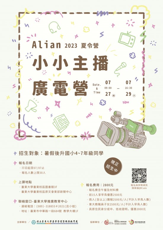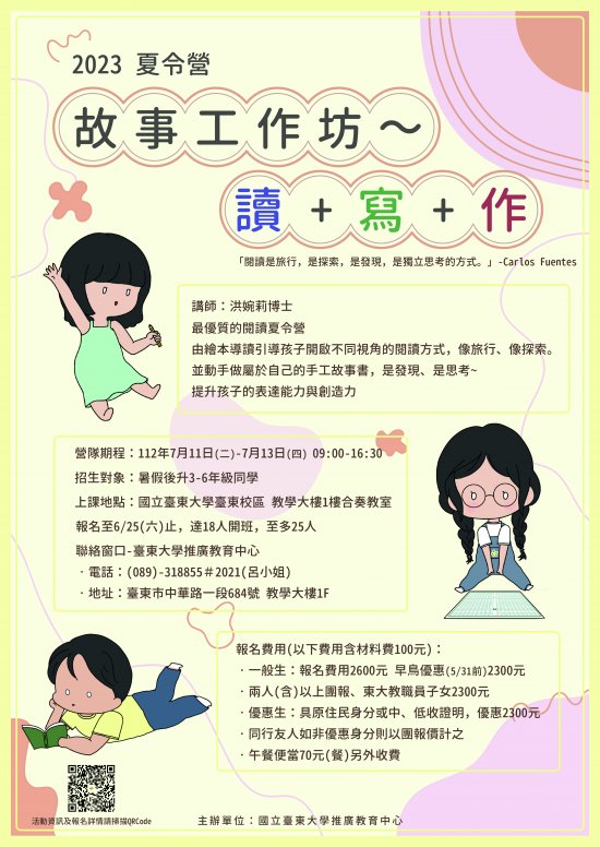 更多活動內容詳官網:國立臺東大學推廣教育中心夏令營專區,網址https://coce.nttu.edu.tw/p/412-1005-8594.php?Lang=zh-tw。