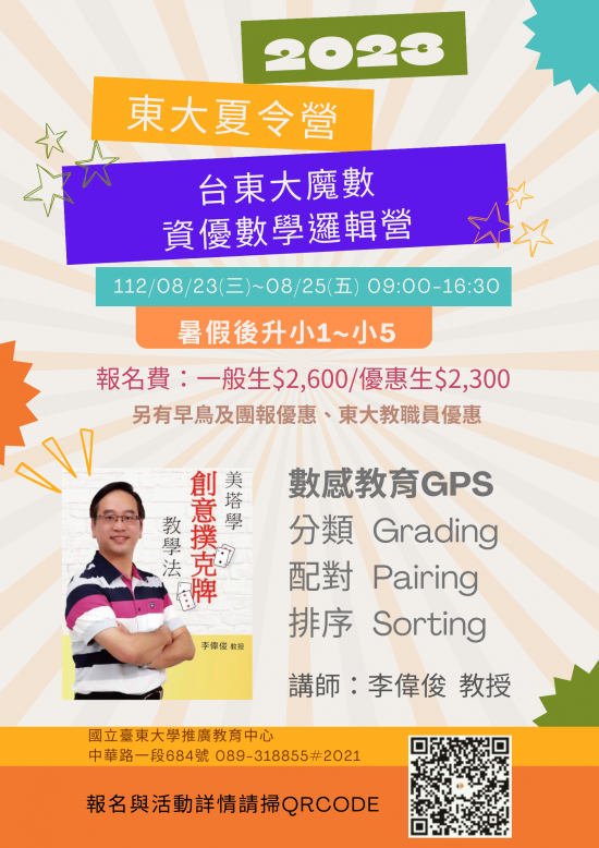 「臺東大魔數-資優數學邏輯營」招生對象為暑假後升小1至小5之兒童,由美塔學發明者李偉俊教授授課,從遊戲中體驗GPS數感教育,打造數學邏輯腦。
