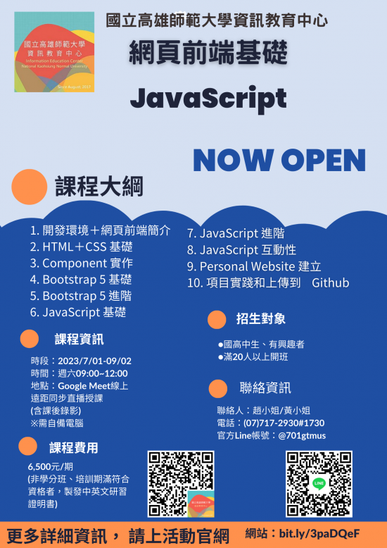(二)JavaScript 網頁前端基礎課程【國高中線上班】。上課日期 2023/07/01~2023/09/02每週六早上 9:00~12:00 開課,共10堂。