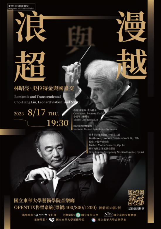 國立東華大學藝術學院與音樂系精心策畫,由享譽國際樂壇的臺裔小提琴家林昭亮與美藉指揮家史拉特金和國立臺灣交響樂團同台獻藝,演出巴伯的小提琴協奏曲,柴可夫斯基的第五號交響曲。名家聯袂登台,花蓮閃耀登場,讓您耳目一新,絕對值回票價!東華2023經典音樂饗宴,為您增添璀璨時光!