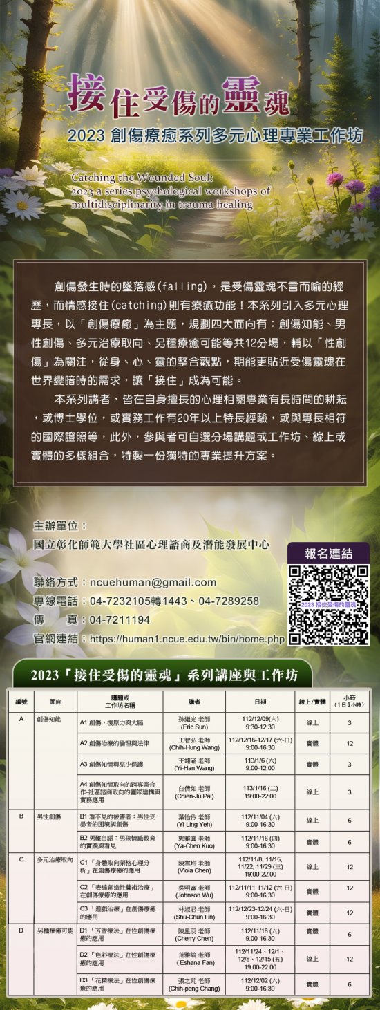 三、詳細資訊請連結至本校社區心理諮商及潛能發展中心網頁:http://human1.ncue.edu.tw/bin/home.php或見附件簡章。