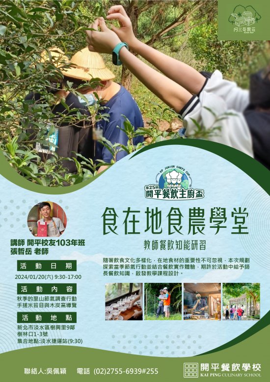 四、報名方式:採線上報名,請上”全國教師在職進修資訊網”報名,課程名稱:食在地食農學堂-教師餐飲知能研習,課程代碼:4135420。報名截止日期:2024/01/17,課程名單將於開課前三天確認遴選名單。