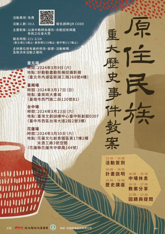 | 為使社會大眾更容易且廣泛認識原住民族歷史,文化部文化資產局與教育部攜手,從原住民族觀點出發,共製原住民族重大歷史事件3D動畫,並開發教案,希冀提供學校教師更多教學素材,將於113年3月份辦理4場次教案工作坊,邀請歷史學者講述重大歷史事件對原住民族的影響,同步分享動畫教案的成果。 |