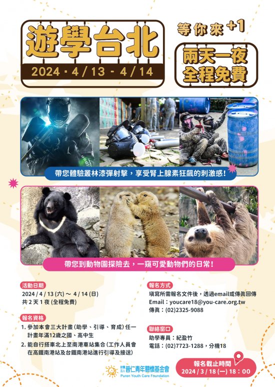 一、本會將於2024年04月13日(六)至04月14日(日),舉辦2024年遊學台北青少年體驗活動,費用全免,凡參與本會助學計畫、引導計畫或育成計畫之國、高中生皆可報名。(含2024年7月開始受助學生)