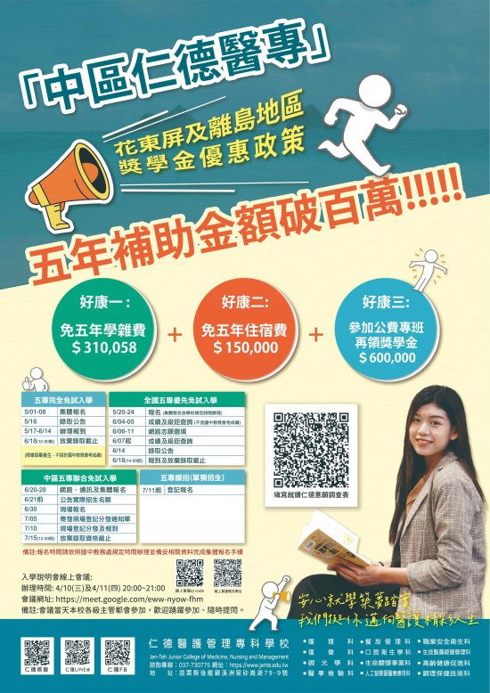 | 二、 | 為使有意願就讀之學生及家長了解上述招生資訊及辦學特色,特於4/10(三)及4/11(四)20:00~21:00舉辦兩場次的線上說明會,邀請仁德醫專相關主管線上面對面提供諮詢服務,讓您更了解入學前、後之各項重要資訊。報名網址:https://forms.gle/kveLFyd2kwZa9WzE8 |