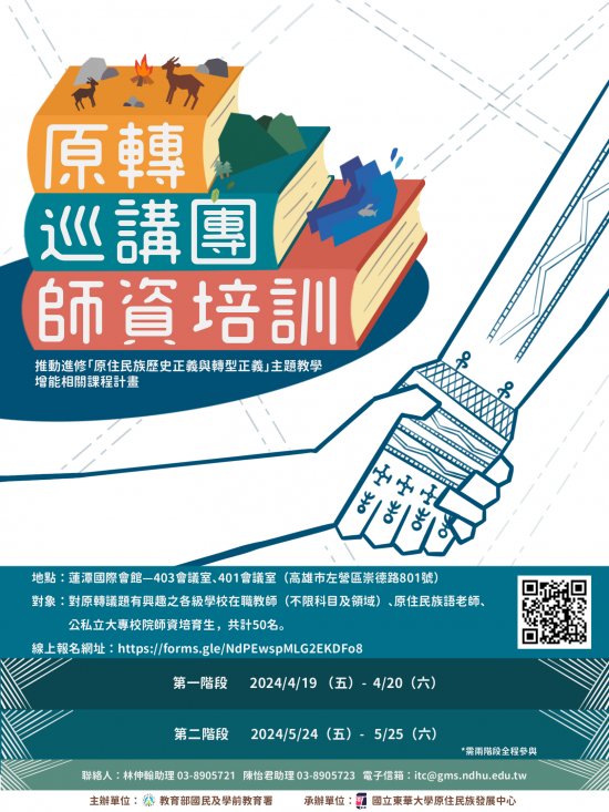 | (三) | 培訓對象:對原轉議題有興趣之各級學校在職教師(不限科目及領域)、原住民族語老師、公私立大專校院師資培育生,共計50名。培訓成員完整參與兩階段課程及交付作業者,即授予研習證書與成為原轉巡講團師資。 |