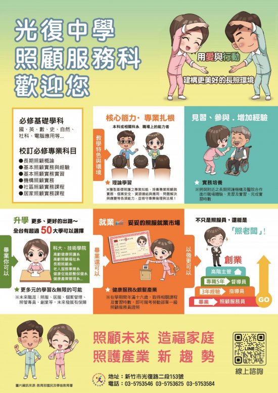 說明: 一、依據113年4月15日新竹市私立光復高級中學竹光復實字第1130000471號辦理。 二、該校新設立照顧服務科,針對花蓮縣及臺東縣國中畢業生進行視訊宣導。 三、就學三年免學雜費,該校校園內備有宿舍有專人照顧管理,住宿費有優惠。 四、學校相關介紹網站:https://www.kfsh.hc.edu.tw/,宣導意願表https://forms.gle/2Vn4XLJHt8oAKRMFA。
