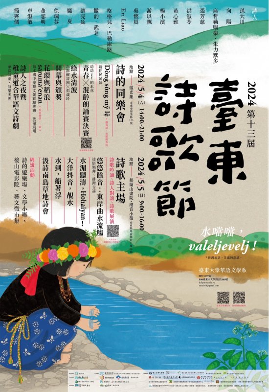 | 一、 | 臺東詩歌節今年以「水噹噹,valeljevelj!」為題,從臺東╱臺灣出發,連結世界南島民族文學家,在族群多元、文化多彩、語言繽紛、風土靚秀、人情真媠的「臺東」,以詩歌的對談、展演與再製等多重表現形式,詮釋與流佈南島人文風華。 |