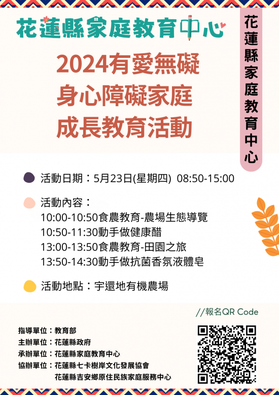 說明: 一、依據113年5月1日花家教字第1130000696號函辦理。 二、為鼓勵本縣身心障礙家庭提升社會參與,增進正向情緒支持與家庭凝聚力,預定於113年5月19日和5月23日辦理相關成長課程(詳如附件)。