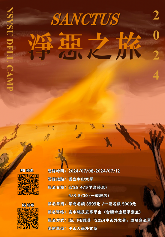 | (六) | FB粉絲專頁(2024中山外文營):https://www.facebook.com/profile.php?id=61556837051726;IG專頁(Sanctus.2024):https://www.instagram.com/sanctus.2024?igsh=dGdlenRmcnM5OXZ2 |