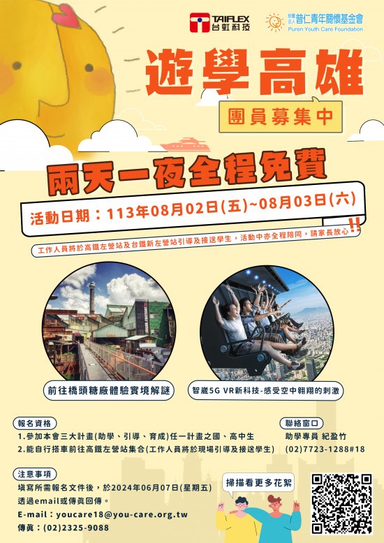 說明: 一、本會將於113年08月02日(五)至08月03日(六),舉辦2024年遊學高雄青少年體驗活動,費用全免,凡參與本會助學計畫、引導計畫或育成計畫之國、高中學生,皆可報名。 二、報名期間自即日起至113年06月07日止,因名額有限,故將進行甄選,請 貴校承辦人員惠予協助轉知受助學生,鼓勵踴躍報名參加,將學生報名資料回傳至本會。 三、檢附報名簡章、報名文件、肖像權同意書、活動海報各一份。 四、若有不盡事宜請洽本會助學專員紀盈竹。