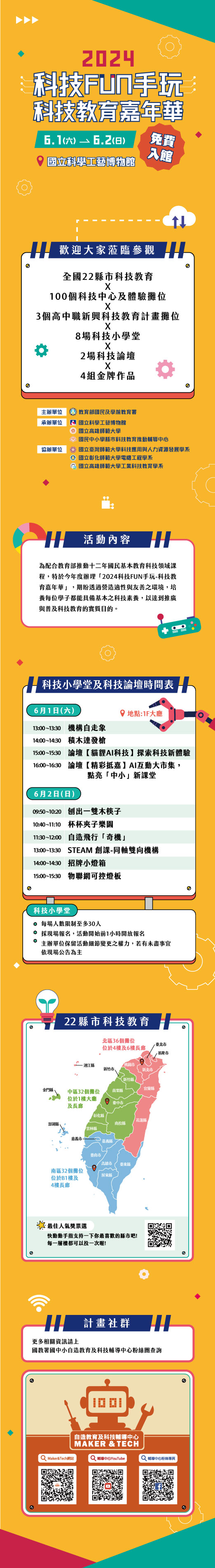| 一、 | 旨揭活動係由教育部國民及學前教育署主辦,科學工藝博物館與國立高雄師範大學共同承辦,活動內容包含全國22縣市科技教育及100個自造教育及科技中心年度成果展示,期盼藉此機會引發參與民眾與師生對於科技教育的興趣。 |