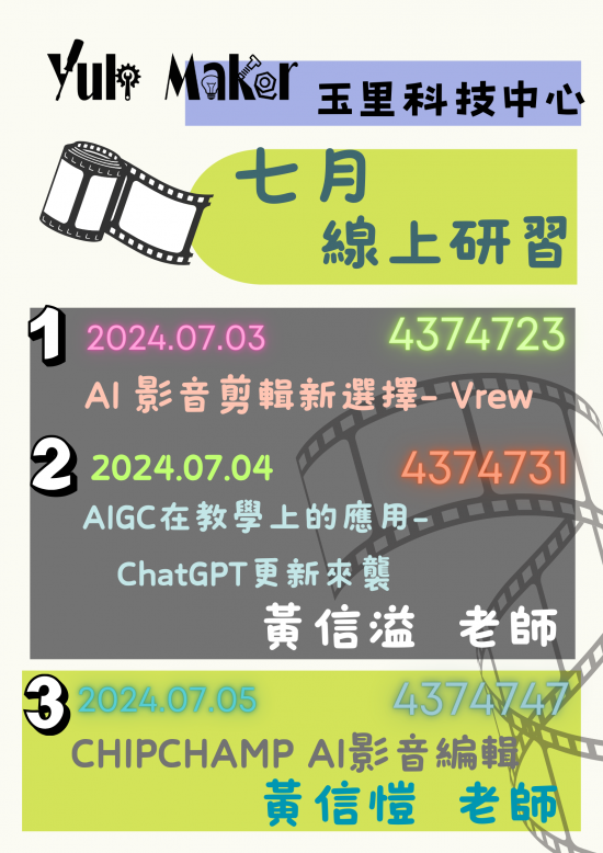 玉里國中科技中心擬於113年7月辦理四場科技領域教師研習,惠予參加人員公假登記,詳如附件檔案。