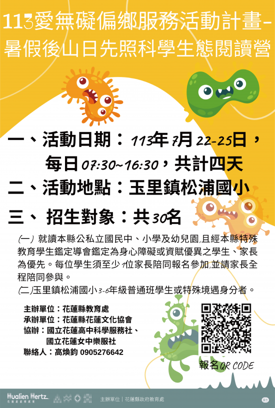 二、旨揭活動訂於113年7月22日(一)至7月25日(四)於玉里鎮松浦國小辦理,詳情請參閱活動計畫書及報名文宣,如有疑義,請逕洽委辦單位:花蓮縣花蓮文化協會,連絡電話:0905-276642。