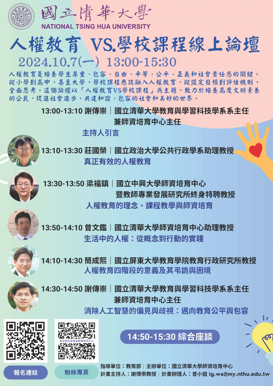 二、 本次論壇以「人權教育 VS.學校課程」為主題,人權教育有助於提升學生的權利意識與社會責任感,並應融入學校課程,培養尊重、包容及公平正義的公民,促進社會進步。
