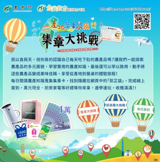 三、為使大眾更加瞭解食農教育並探索在地農產,預訂於113年9月13日至10月13日舉辦「產地到餐桌小旅行 集章大挑戰」食農教育推廣活動( https://fae.moa.gov.tw/202409event/ ),提供食農教育相關知識集章挑戰、網頁捉迷藏、簽到打卡等遊戲,參與活動即可抽獎,包含萬元現金、廚房家電、禮券等多項好禮,歡迎踴躍參與。