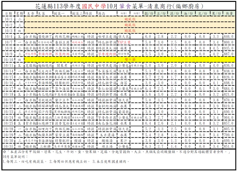 【學校午餐】東里國中113學年第1學期10月菜單(修)