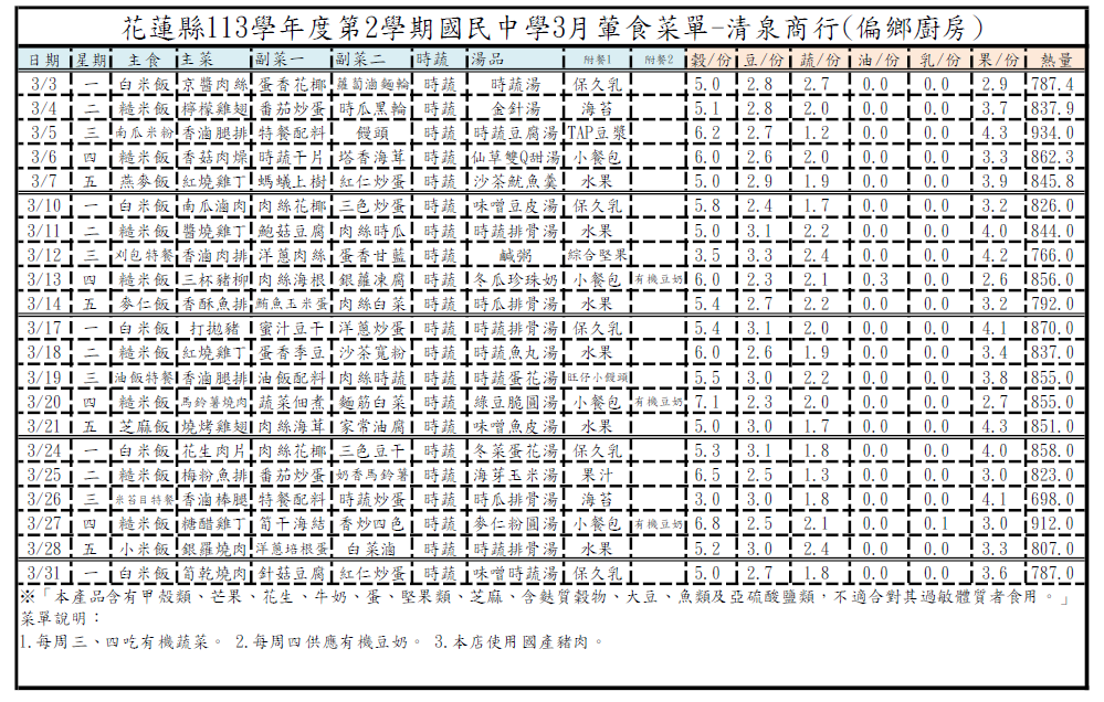 【學校午餐】東里國中113學年第2學期3月菜單