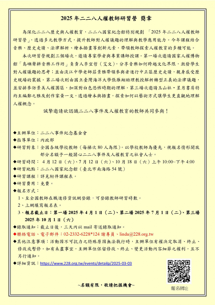 三、 該會將於今年4月12日(星期六)、7月12日(星期六)及10月18日(星期六)假二二八國家紀念館舉辦「2025年人權教師研習營」活動,敬請貴校協助轉知旨揭活動資訊,鼓勵所屬教師參與。